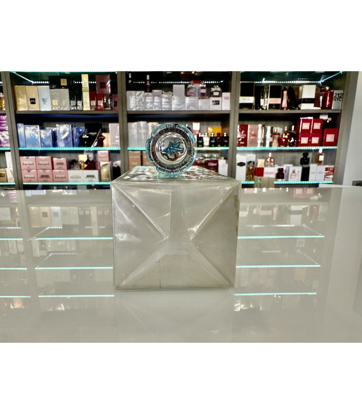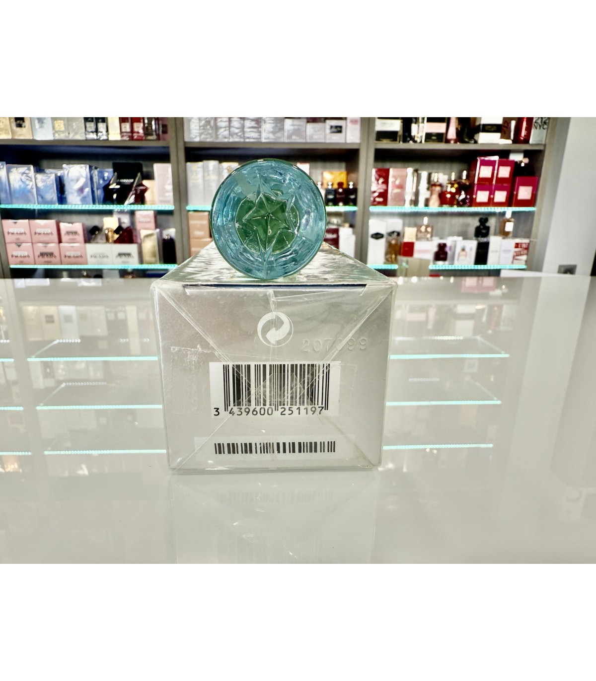 - Prezentowany egzemplarz posiada zmienioną barwę płynu, co wynika z naturalnego procesu degradacji barwnika CI 42090 (Błękit brylantowy FCF), który z czasem traci swoje właściwości kolorystyczne. Zjawisko to jest charakterystyczne dla perfum tej kompozycji i szczególnie często występuje w egzemplarzach unikatowych oraz vintage.